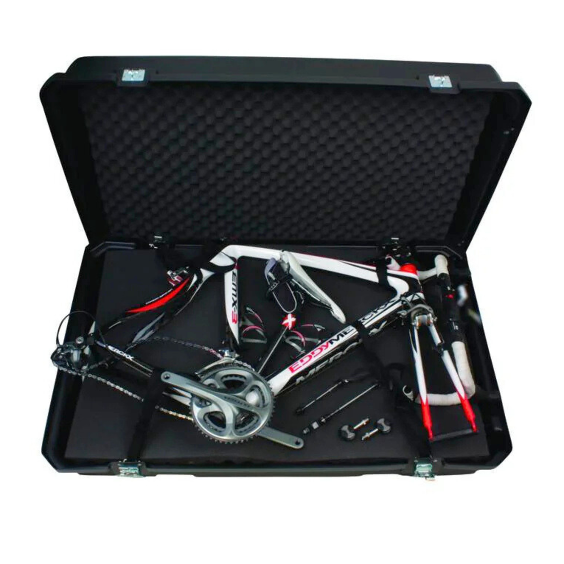 The hardshell case, three layers of high density foam to secure your bike and separate the wheels from the rest of the bike, four internal straps to secure your bike, some terrycloth towels for protection and keeping the foam protected from bike grease, and four locking latches. Once packed, this case is pretty bullet proof and easy to get around with the hand strap and rolling casters.