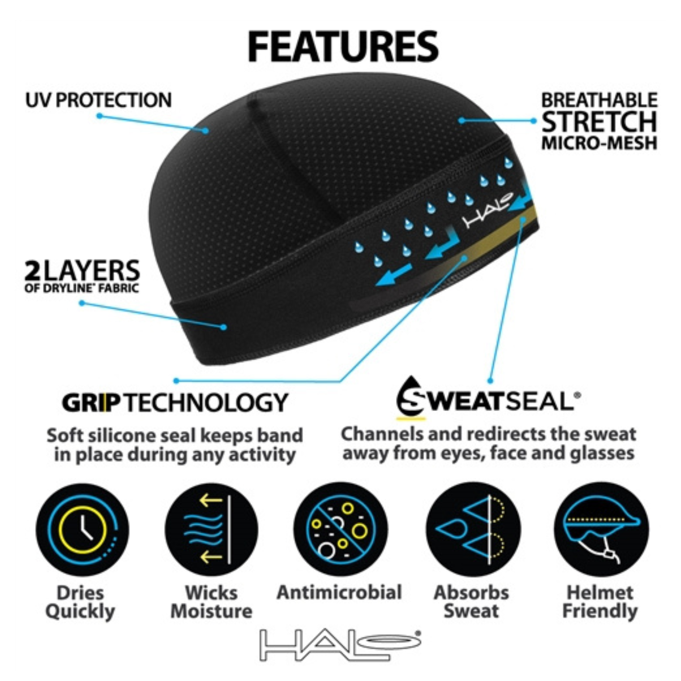 The all-weather, “one-size-fits-most” Halo Skull Cap is an excellent choice for activities like mountain biking, road cycling and gravel bike riding. During cooler weather, the cap can be adjusted to fit over your ears for warmth and wind protection. This sweat-wicking cap features a breathable, micro-mesh stretch top that provides excellent sun protection with a UPF maximum rating of 50. The Halo Skull cap smoothly fits under helmets. If you’re a trail runner, marathoner, triathlete, ultra marathoner or just love to run, this skull cap is for you. It is comfortable, absorbs sweat and channels sweat away from your eyes.