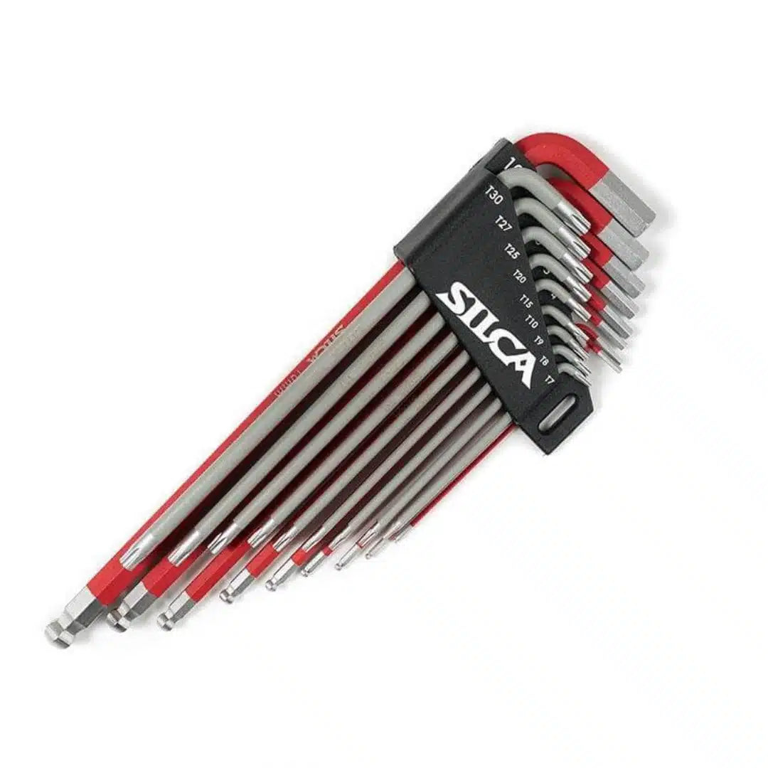 The perfect complete set of S2 Steel Allen and Torx keys for when you are on the go. In a tidy carrier, always have every Allen and Torx key you may need on a bicycle. Few tools are used as frequently and can cause as much heartache or wasted time as the seemingly simple Hex and Torx¬¨?Ü keys. It‚Äö's one of the first things you notice at the top levels of motorsport tools, or in the toolboxes of Pro-Tour mechanics: extremely high-quality tools. The reasoning is simple, better tool fit leads to better feel and confidence for the mechanic as well as a significant reduction in the likelihood of damaging exotic fasteners made from Titanium or Aluminum. High strength S2 steel tools ‚Ģ Precise tool interface ‚Ģ Polymer coating for superior grip ‚Ģ Compact tool holder ‚Ģ H1.5, H2, H2.5, H3, H4, H5, H6, H8, H10 ‚Ģ T7, T8, T9, T10, T15, T20, T25, T27, T30 ‚Ģ T7 tool features 100 degree bend rather than 90 for improved control and access to very small fasteners