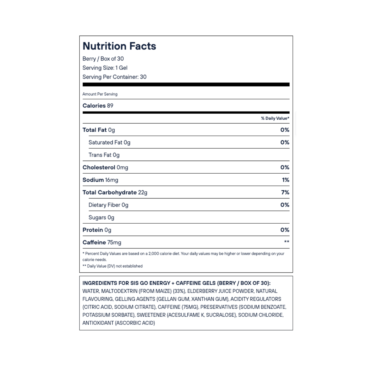 Ingredients for SiS GO Energy + Caffeine Gels (Berry / Box of 30): Water, Maltodextrin (from Maize) (33%), Elderberry Juice Powder, Natural Flavouring, Gelling Agents (Gellan Gum, Xanthan Gum), Acidity Regulators (Citric Acid, Sodium Citrate), Caffeine (75mg), Preservatives (Sodium Benzoate, Potassium Sorbate), Sweetener (Acesulfame K, Sucralose), Sodium Chloride, Antioxidant (Ascorbic Acid)Out of Stock
