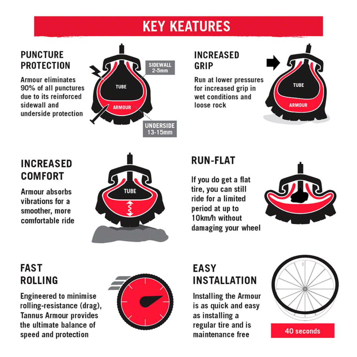 Tannus Armour is the ultimate in tire protection and performance for all levels and styles of riding. Sitting between your tire and inner tube, the Tannus Armour provides 15mm of puncture protection on the top, as well as 2mm of sidewall protection from sharp objects and rocks. Whether you are a city biker, adventure tourer or prefer the off-road, downhill or gravel trails, Tannus Armour gives you increased grip and vibration dampening for a smoother, more comfortable and enjoyable ride.